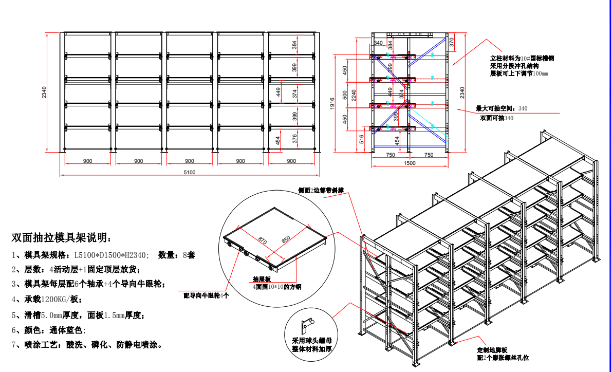 1、模具架規(guī)格:L5100*D1500*H2340 數(shù)量:8套