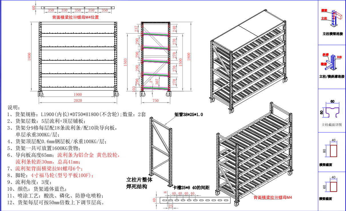 上圖是根據客戶要求貨架規格L1900*W750*H1800 不含腳輪 數量 5套  貨架層數:5層流利+頂層鋪板 貨架每層配18條流利條,配10塊導向板 單層承重300KG/層貨架頂層配0.6mm鋼層板,承重100KG/層 貨架一共可放置1600KG貨物,導向板高度65mm 流利條為鋁合金,黃色膠輪 流利條輪距30mm 總高41mm 腳輪采用4寸福馬輪 流利條角度為3度 貨架每層可按50mm倍數上下調節層高.