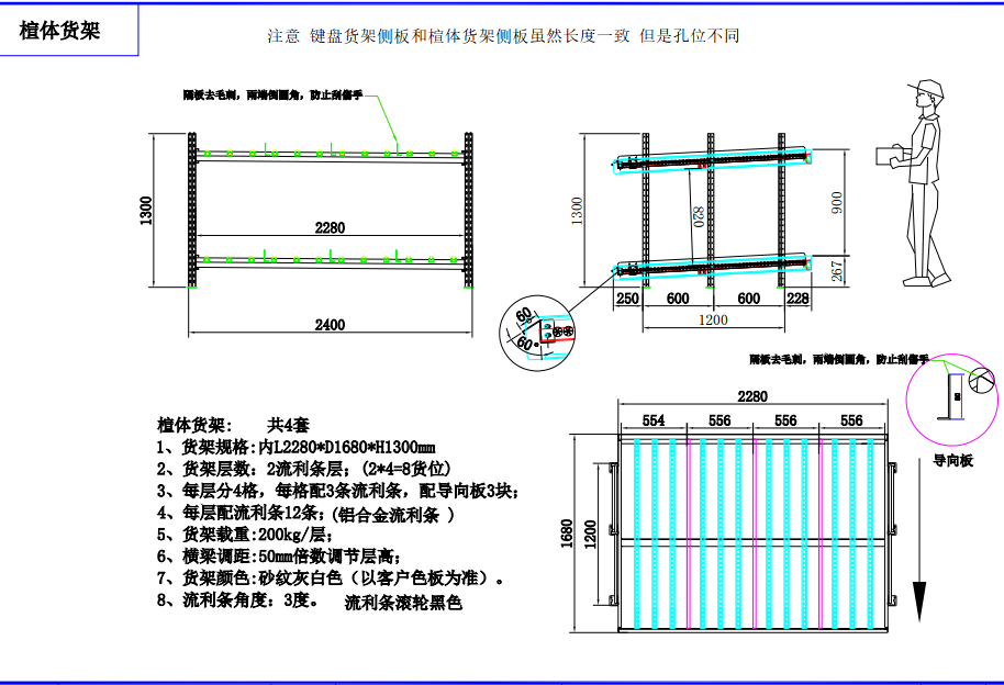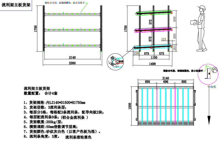 上圖是我們司給聯想公司生產的流利式貨架,貨架參數是:L2140*W1500*H1750 三層流利條 每層分3格、每層配3條流利條,配導向板2塊、每層配9條流利條(鋁合金流利條)每層載重200KG 橫梁調距是50mm倍數調節層高。貨架顏色:以客戶樣本為準 流利條的角度為3度,流利條滾輪黑色.